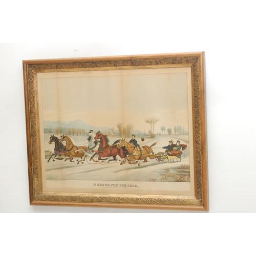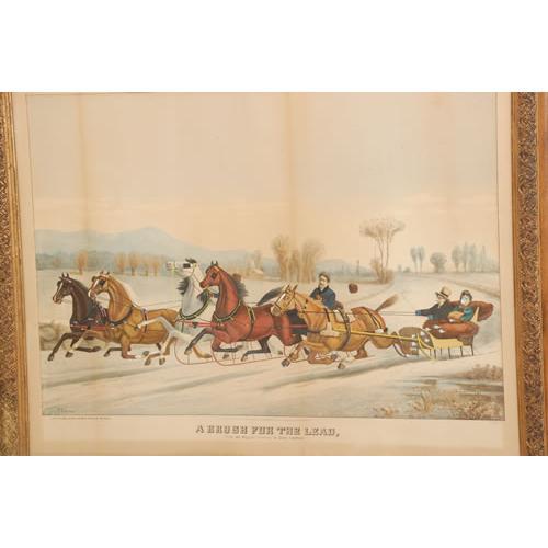 1875 WHITE & PIPLAR COLORED LITHOGRAPH-"A BRUSH FOR THE LEAD" COMIC VIEW OF A VICTORIAN HORSE DRAWN SLEIGH RACE ON A COUNTRY ROAD (AFTER SCOTT LEIGHTON ORIG.)- IN A CUSTOM MOLDED PLASTER & WOOD FRAME (21" X 27.5")- TONING, STAIN, IMPERFECTIONS