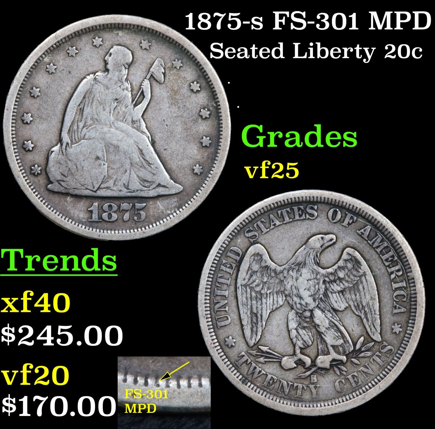 1875-s FS-301 MPD Twenty Cent Piece 20c Grades vf+.