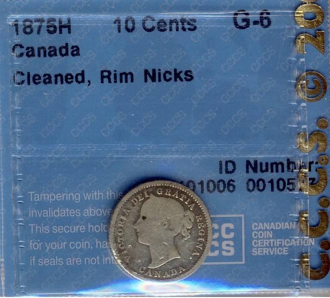 1875H 10¢ CCCS G-6, very lightly cleaned and a few rim nicks. Overall a nice example