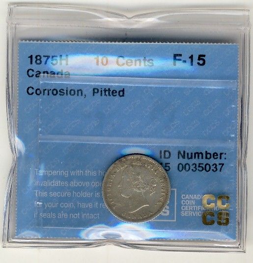 1875H 10 Cents CCCS F15. A key issue with issues, designated as corroded and pitted.