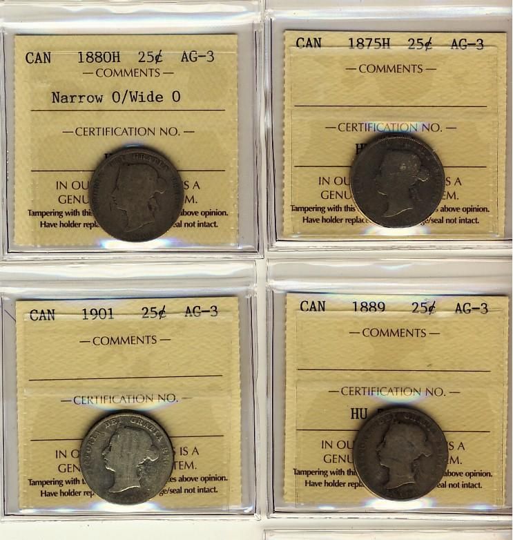 1875H , 1880H Nar/Wd, 1889, 1901 25¢ ICCS AG-3. Lot of 4 coins including 2 key dates.