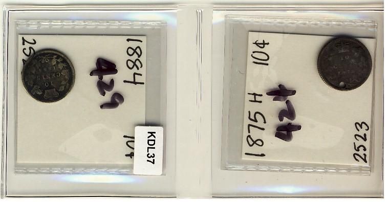 1875H & 1884 10¢. Lot of 2 key date coins. The 1875H grades G4 with hole and the 1884 AG-3.