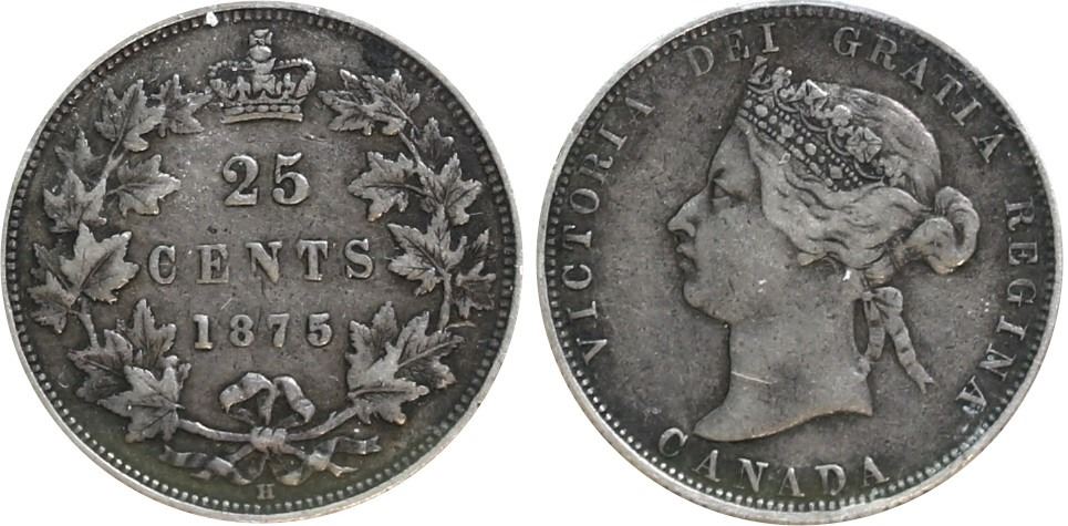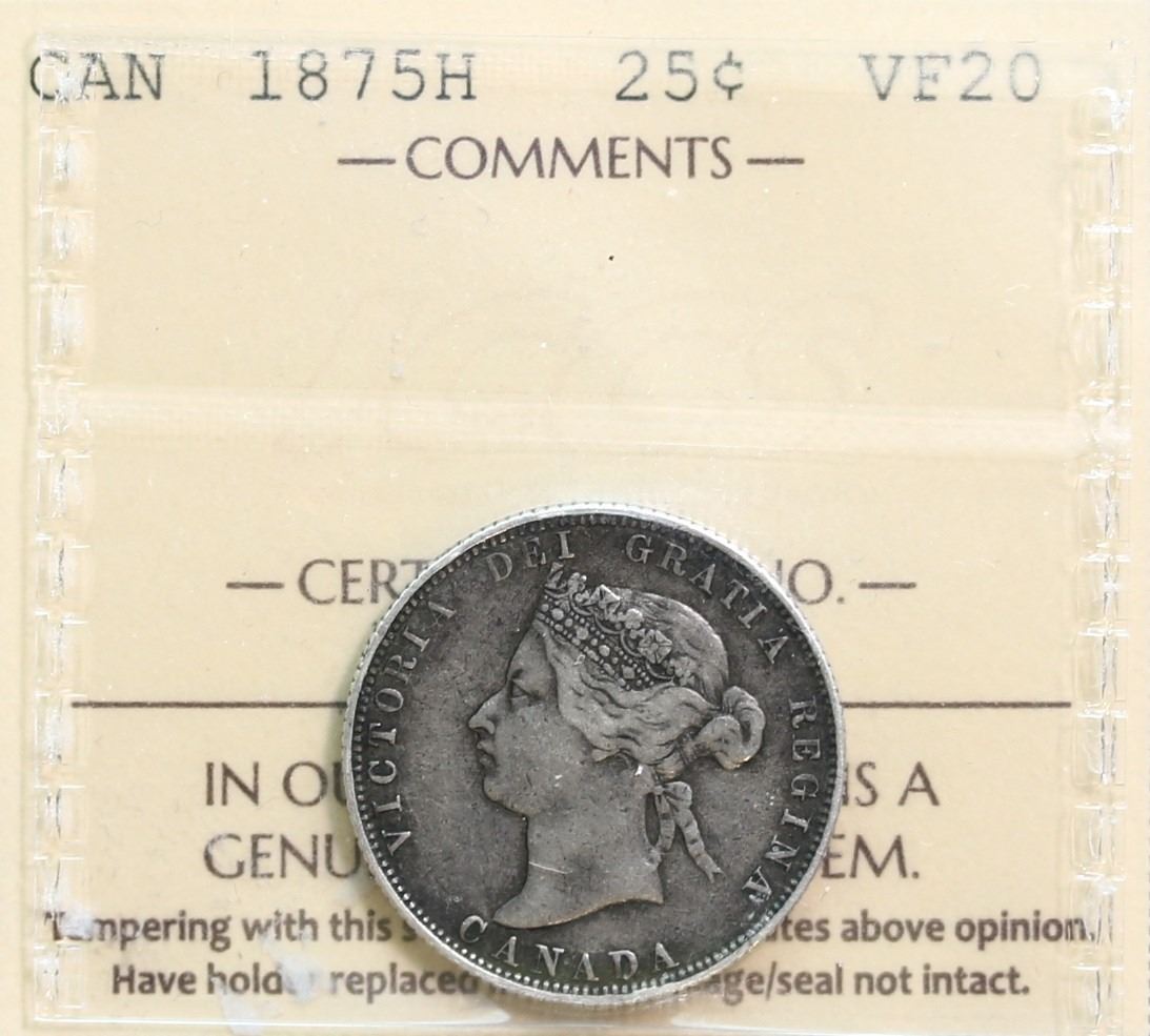 1875H 25¢ "Blunt 5" ICCS Very Fine-20. Nice example of this scarce and sought-after key date.