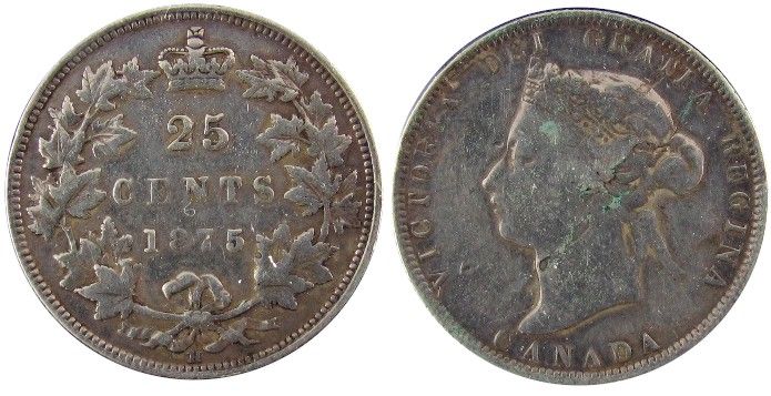 1875H 25¢ Fine 15, planchet peel/cleaned. Key date.