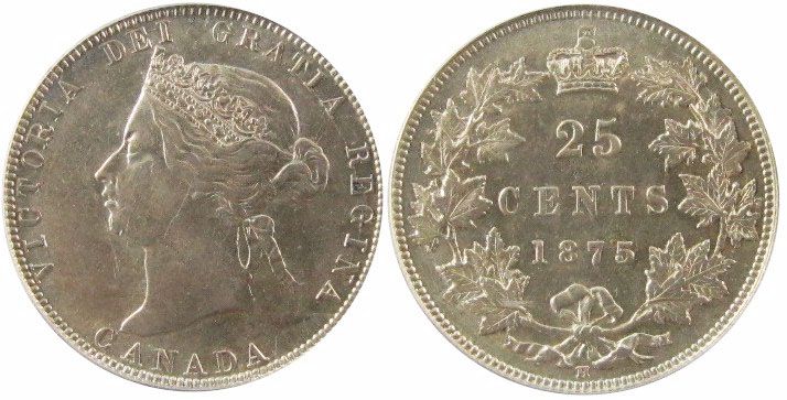 1875H 25¢ PCGS AU55. Difficult issue for grade. Nice full lustre with attractive strike for grade. TOP 5 example.