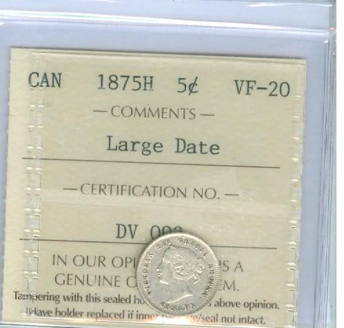 1875H 5¢ Large Date ICCS VF20. White and well struck coin.