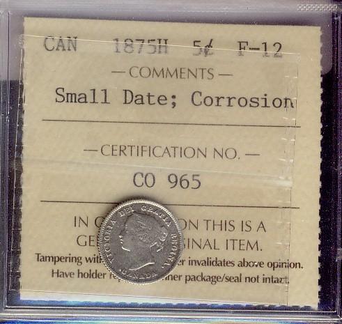 1875H 5¢ Small Date ICCS F12, Corrosion.