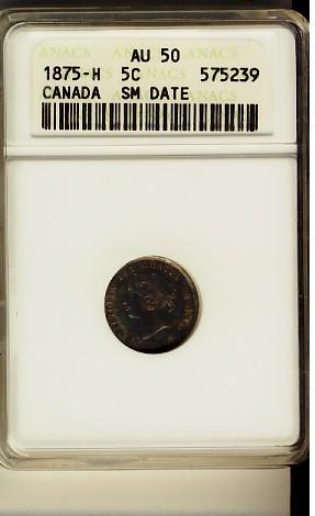 1875H 5¢ Sml Date ANACS AU50. Strong details under rainbow shades.