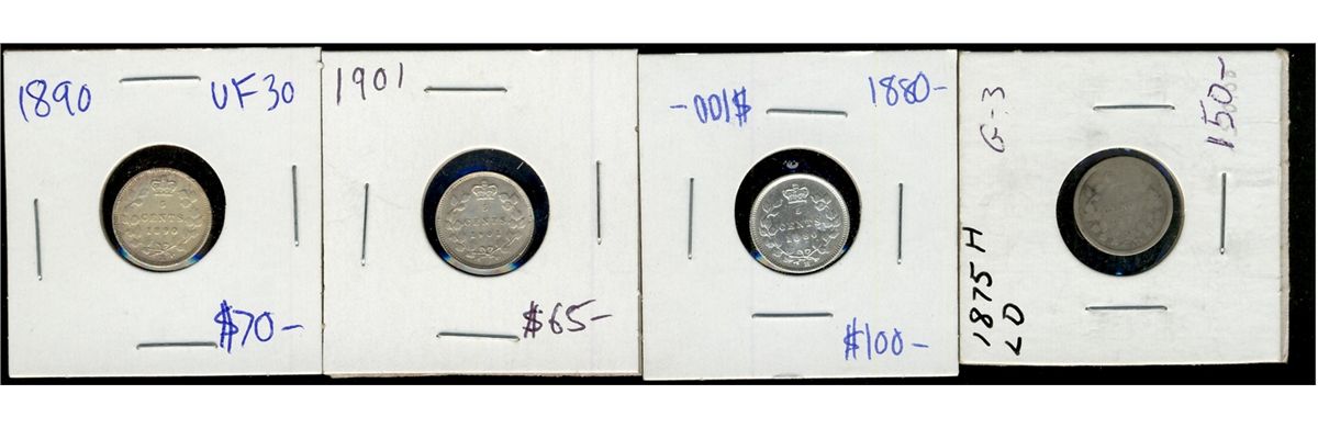 1875H LD 5¢, 1880, 1890 & 1901. Lot of 4 coins G to VF all with minor issues.