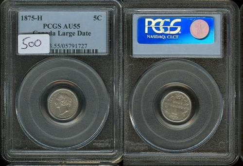 1875H LD 5¢ PCGS AU55 Very scarce variety, especially in this grade. A nice looking coin!