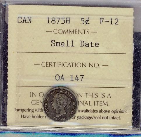 1875H Small date 5¢ ICCS F12, a nice problem free example.