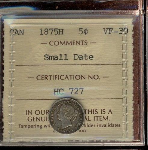 1875H Small date 5¢ ICCS VF30. A nice key date with problem free.