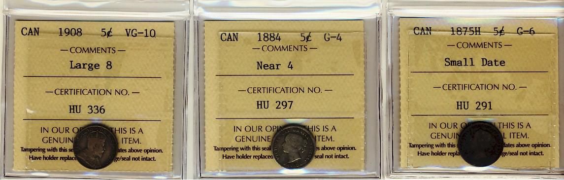 1875H Sml G6, 1884 Nr G4 & 1908 Lg 8 VG10. Lot of 3 coins all ICCS graded. All better dates and/or varieties.