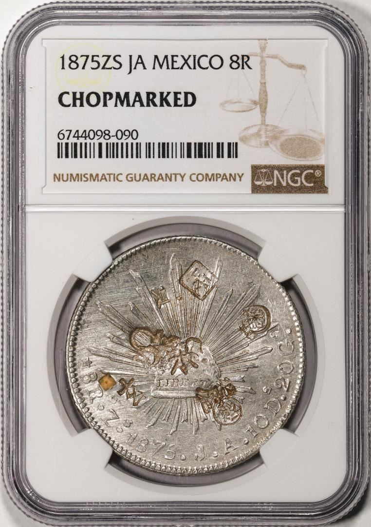 One 1875ZS JA Mexico 8 Reales Silver Coin NGC Chopmarked. NGC Certified.