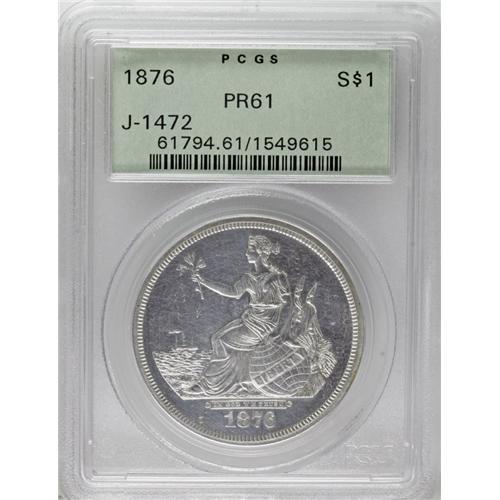 <B>1876 $1 Seated Liberty Commercial Dollar, Judd-1472, Pollock-1623, R.8, PR61 PCGS.</B></I> Liberty by the Sea Shore obverse with the date and IN GOD WE TRUST below. The reverse has COMMERCIAL DOLLAR and 420 GRS, 900 FINE within a wreath, the branches tied by a ribbon with the motto GOD OUR TRUST and the statutory legend around. Struck in silver with a reeded edge. Adams and Woodin commented: "But two specimens said to have been struck." Today, two examples are known, the other piece somewhat finer.<BR><BR><B>PR64 PCGS.</B></I> William H. Woodin; Waldo Newcomer; F.C.C. Boyd; King Farouk (Sotheby's, 2/1954), lot 1965; Dr. J. Hewitt Judd; Abe Kosoff (Bowers and Merena, 11/1985), lot 1100 (plated at lot 1099); American Numismatic Rarities (9/2003), lot 100; American Numismatic Rarities (6/2004), lot 1683.<BR><B>PR61 PCGS. The piece offered here.</B></I> William H. Woodin; H.O. Granberg; unknown intermediaries; Jones Beach Collection.<BR><BR> This example has bright silver surfaces with fully mirrored fields and a trace of hazy toning on the reverse. A few wispy hairlines on each side keep it from a higher grade. There are few pedigree markers of any type on this piece, although a small toning spot is visible immediately below the R of TRUST on the reverse. To the best of our knowledge, this specimen has never before been offered for sale at auction. While it is lower quality than the other specimen, choices are limited when there are just two known examples of any coin. In the case of this pattern issue, a silver dollar pattern struck in silver, there are clearly more than two people with an ownership desire, a situation that will undoubtedly create considerable bidding activity.<BR><I>From The Jones Beach Collection.</B></I><BR><BR><b>Shipping:</b> Coin/Currency (<a target="_blank" href="http://www.heritageauctions.com/common/shipping.php">view shipping information</a>)