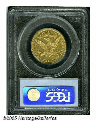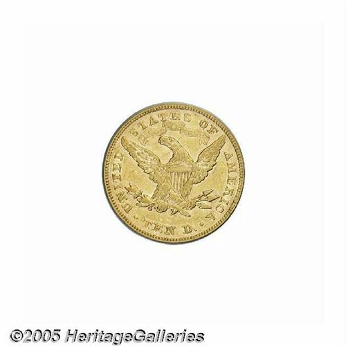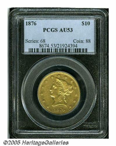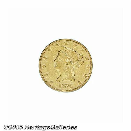 <B>1876<$10> AU53 PCGS.</B></I> A tiny production of 732 pieces, which combines both proofs and business strikes, ensures that the 1876 is among the most challenging issues within the Eagle denomination. Unlike certain ultra-low mintage gold coins of the era (the 1880 Gold Dollar and the 1877 Quarter Eagle come to mind) few 1876 Eagles were set aside, since its face value represented a week's wages for workers of the day. Even the most determined specialists will have to purchase either a proof or an AU example (or both!) since neither PCGS nor NGC has certified any pieces as Mint State. Population: 3 in 53, 4 finer (6/05).