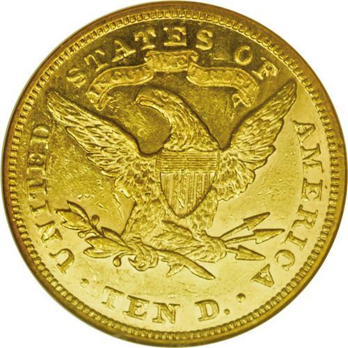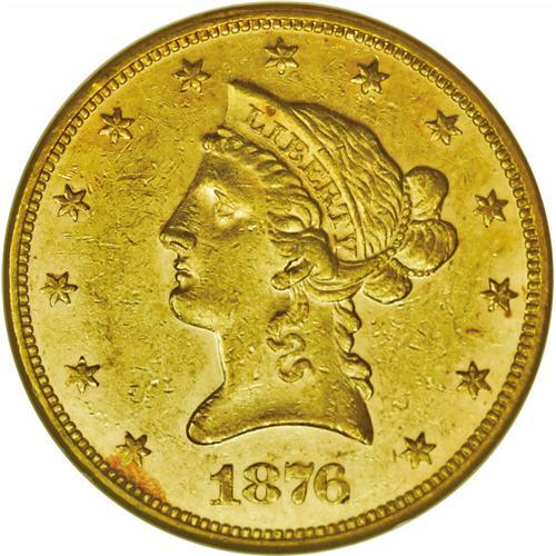 <B>1876<$10> AU58 NGC.</B></I> Although not on the same order of rarity as the near-mythical 1875 Philadelphia issue, the 1876 is quite a collectible (when found) low-mintage emission in its own right, with a production limited to 687 business strikes. Although not designated on the holder, the fields are considerably prooflike, but a light gray-gold overlay apparently prevents that moniker. This is an only slightly circulated example, offering light evidence of highpoint rub, a bold and pleasing strike, and moderate abrasions, none of them distracting. Among the finest graded at either service, and unimprovable as such. Census: 4 in 58, 0 finer (3/06).<BR><I>From The Steve Glenn Collection.</B></I> <BR><BR><B>Important notice:</B> Heritage usually auctions material at the rate of 200-250 lots per hour. On some occasions eBay Live bid software or the Internet may not be able to keep up with the pace of the auction. We recommend placing a realistic absentee bid now as insurance to avoid disappointment. Occasionally the auctioneer may eliminate or reject an eBay Live bid, and the auctioneer may also reopen a lot after the close of the eBay live bidding (usually because we missed an audience bid), and may reject your bid even if it shows you as the winning bidder. By bidding via eBay Live, you agree that Heritage may award the lot to another bidder at its sole discretion under the circumstances described above or any other reasonable circumstances. Since eBay bids are not shown to us until we open the lot on the floor, we treat those bids just like floor bids. In most cases the floor responds before the eBay bid is presented to us, due to Internet lag time, so for consistency we have made it a policy that floor bids are always considered first over tie eBay live bids. Also please note that all Heritage lots purchased through eBay Live carry a 20% Buyer's Premium. Please make sure you read the Terms and Conditions before you bid. This lot is being auctioned in conjunction with a live floor auction by Heritage Galleries & Auctioneers. All final auction and invoice information will be supplied by Heritage Galleries & Auctioneers, and all other information should be considered preliminary. Lot:3979 <BR><BR><B>Winning Notification and Billing:</B> After the FINAL session in this auction is complete, Heritage will send e-mail and snail mail invoices. This process normally takes several days. All final auction and invoice information will be supplied by Heritage Galleries & Auctioneers, and all other information should be considered preliminary. <BR><BR>This auction will be conducted on a live auction floor and over the Internet through eBay Live. If you choose to place an absentee bid, please take a moment to <font color='#0000ff'><u><a href='http://pages.ebay.com/liveauctions/help/before/laabsentee.html'>learn how eBay Live absentee bidding works</a></u></font><font color='#000000'>