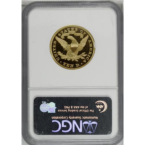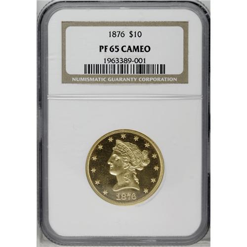 <B>1876<$10> PR65 Cameo NGC.</B></I> Although we cannot be certain, this example appears to be the Trompeter Collection specimen, handled by our firm via private purchase and sale a number of years ago. A catalog for the collection was originally prepared by another auction firm, but the sale did not take place. In the manuscript for that sale, this coin was described: "Identifiable by two lintmarks between first and second stars. Mellow pinkish gold toning with orange overtones gives the coin a well proportioned look. Such nice toning is uncommon. It seems to further enhance the already beautiful cameo appearance." The description mentioned two lintmarks between stars 1 and 2, and, indeed, this coin has two lintmarks at that location. No previous pedigree is available for this example. This example is fully struck with sharply squared rims and fully defined design elements.<BR> Just as the other proof gold coins of this year, the mintage was limited to only 45 coins. Today, approximately 15 examples still survive. Larger denomination gold proofs did not survive in the same numbers as the smaller denomination coins. This is purely a matter of economics, as each coin tied up a substantial amount of money at that time. Ten dollars or 20 dollars was a considerable sum to expend for a single coin at the time, and retaining multiple examples representing various dates was a significant proposition. Cost-of-living calculators available on the Internet tell us that 10 dollars in the year 1913 is equivalent to 200 dollars today. Obviously, 10 dollars in 1876 would be worth even more today. If a collector held some of these gold proofs when falling on economic hard times, the largest denominations would be spent first.<BR> Not only are proof examples of this issue rare, but business strikes are similarly rare. Only 687 examples were coined for circulation, with Mint State survivo <BR><BR><B>Important not