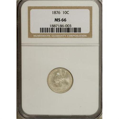 <B>1876 10C MS66 NGC.</B></I> Type One Reverse. The silver-white surfaces exhibit touches of light tan color and frosty luster. A shimmering and well-preserved Premium Gem, boldly struck save for the usual softness on a few cereal grains on the upper left wreath. A lovely type piece. Census: 22 in 66, 4 finer (7/07).<BR><BR><B>Coin Engraver:</B> Christian Gobrecht<BR><BR><b>Shipping:</b> Coins & Currency (<a target="_blank" href="http://www.heritageauctions.com/common/shipping.php">view shipping information</a>)