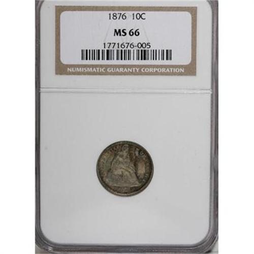 <B>1876 10C MS66 NGC.</B></I> Both sides offer swirling, lively luster beneath vibrant emerald, blue-green, and gold-orange patina. Well struck overall, and a touch of softness at Liberty's head and the upper wreath has minimal impact on the overall eye appeal. Census: 23 in 66, 4 finer (10/07).<BR><BR><B>Coin Engraver:</B> Christian Gobrecht<BR><BR><b>Shipping:</b> Coins & Currency (<a target="_blank" href="http://www.heritageauctions.com/common/shipping.php">view shipping information</a>)