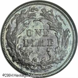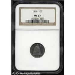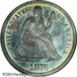 1876 10C MS67 NGC. Type One Reverse. The E in ONE <B>1876 10C MS67 NGC.</B></I> Type One Reverse. The E in ONE is close to the leaves of the wreath. Golden-brown, aquamarine, and lilac colors enrich this lustrous and attractively struck Superb Gem. A beautifully toned and impressively undisturbed Centennial year Gem. A high mintage issue, but the vast majority of survivors are in well circulated or lower Mint State grades. In fact, this is the single finest 1876 Dime we have handled since we began keeping records. The combined population of both PCGS and NGC is 6 in 67, 0 finer (11/04). <BR><BR><B>Important notice:</B> Heritage usually auctions material at the rate of 200-250 lots per hour. On some occasions eBay Live bid software or the Internet may not be able to keep up with the pace of the auction. We recommend placing a realistic absentee bid now as insurance to avoid disappointment. Occasionally the auctioneer may eliminate or reject an eBay Live bid, and the auctioneer may also reopen a lot after the close of the eBay live bidding (usually because we missed an audience bid), and may reject your bid even if it shows you as the winning bidder. By bidding via eBay Live, you agree that Heritage may award the lot to another bidder at its sole discretion under the circumstances described above or any other reasonable circumstances. Since eBay bids are not shown to us until we open the lot on the floor, we treat those bids just like floor bids. In most cases the floor responds before the eBay bid is presented to us, due to Internet lag time, so for consistency we have made it a policy that floor bids are always considered first over tie eBay live bids. Also please note that all Heritage lots purchased through eBay Live carry a 20% Buyer's Premium. Please make sure you read the Terms and Conditions before you bid. This lot is being auctioned in conjunction with a live floor auction by Heritage Galleries & Auctioneers. All final auction and invoice information will be supplied by Heritage Galleries & Auctioneers, and all other information should be considered preliminary. Lot:5719