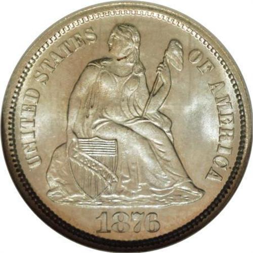<B>1876 10C MS67 NGC.</B></I> Type One Reverse. A lustrous and lightly toned Superb Gem with refreshingly mark-free fields and devices. The strike is precise, even on the upper left cereal grains. A wonderful souvenir from our centennial year. Struck from prominently clashed dies. Census: 4 in 67, 0 finer (7/07).<BR><BR><B>Coin Engraver:</B> Christian Gobrecht<BR><BR><b>Shipping:</b> Coins & Currency (<a target="_blank" href="http://www.heritageauctions.com/common/shipping.php">view shipping information</a>)