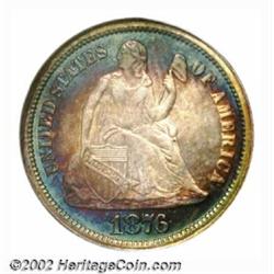1876 10C PR66 NGC. Ex: P. Kaufman. Type I Reverse, the only known hub variety of the proof 1876 Dime, and the more common of the two known varieties of the business strike. From an original proof delivery of 1,150 pieces comes this truly remarkable Gem. The toning is colorful and undeniably original with pearl-gray centers framed by mottled cobalt-blue peripheral iridescence. The latter color is more extensive on the obverse, but both sides reveal warm reddish-gold undertones as the coin turns into the light. As one would expect of a specimen striking, the definition is uncommonly sharp for the type with particularly impressive detail over Liberty's head and at the top left of the reverse wreath. There is not a single outwardly distracting handling mark, and the fields glisten with reflectivity at most angles. Population: 6 in 66, with only three finer (7/02).From the Philip Kaufman Collection. Important notice: We expect to be auctioning lots at the rate of 200-250 per hour. Sometimes eBay Premier live bid software cannot keep up with that pace, so we strongly recommend that you place a realistic proxy bid now as insurance to avoid disappointment. Also please note that all Heritage/CAA lots purchased through eBay Premier carry a 20% Buyer's Premium. Please make sure you read the Terms and Conditions.