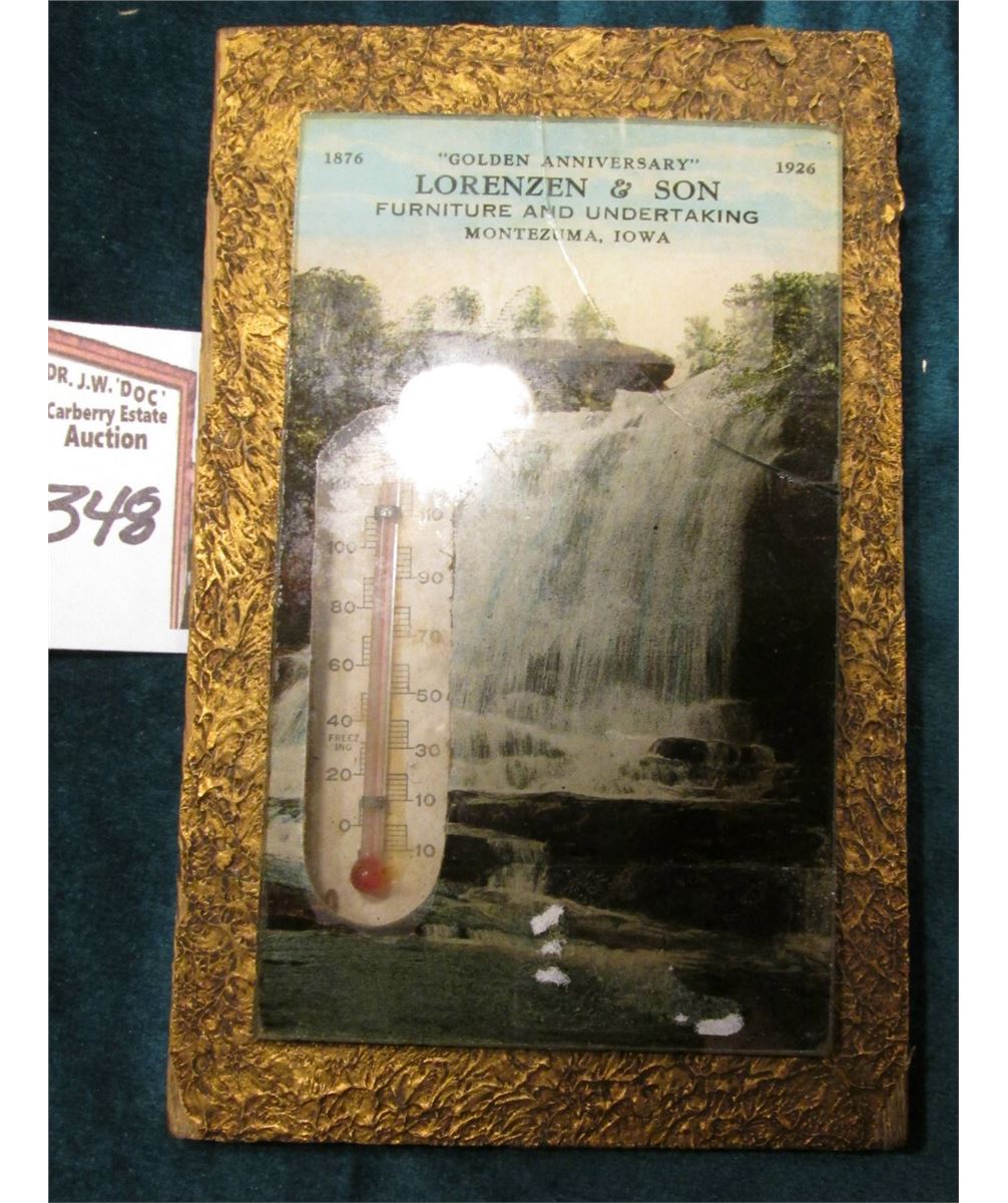 "1876 1926 "Golden Anniversary Lorenzen & Son/Furnitiure and Undertaking/Montezuma, Iowa", reverse "Product of the Holabird Co. Bryan, Ohio" Wall Advertising Thermometer. Crack in the Glass covering noted, buy basicly a one of a kind local town souvenir from 90 years ago.