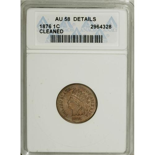 <B>1876 1C --Cleaned--ANACS. AU58 Details.</B></I> NGC Census: (14/133). PCGS Population (17/48). Mintage: 7,944,000. Numismedia Wsl. Price: $217. (#2124)<BR><BR><b>Shipping:</b> Coins & Currency (<a target="_blank" href="http://www.heritageauctions.com/common/shipping.php">view shipping information</a>)