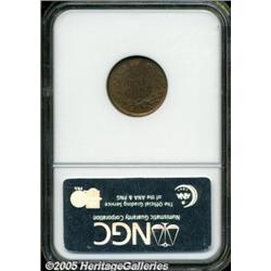 <B>1876 1C Indian Cent--Retained Die Break--MS64 Red and Brown NGC.</B></I> This intricately struck better date Cent exhibits substantial peripheral peach color, although the centers have acquired lilac-blue hues. A bold die crack between 8 and 10 o'clock on the reverse confirms the NGC insert annotation.