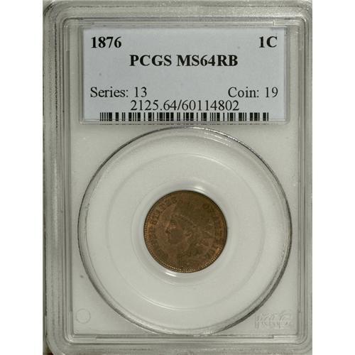 <B>1876 1C MS64 Red and Brown PCGS.</B></I> PCGS Population (160/54). NGC Census: (218/218). Mintage: 7,944,000. Numismedia Wsl. Price for NGC/PCGS coin in MS64: $380. (#2125)<BR><BR><b>Shipping:</b> Coins & Currency (<a target="_blank" href="http://www.heritageauctions.com/common/shipping.php">view shipping information</a>)
