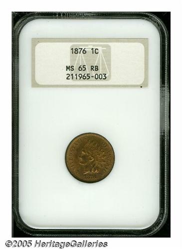 <B>1876<1C> MS65 Red and Brown NGC.</B></I> Well struck with shimmering, cherry-red color beneath the light overlay of brown. A well struck example with great devices, there are a few flyspecks that do not detract from the attractiveness of this piece.
