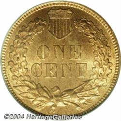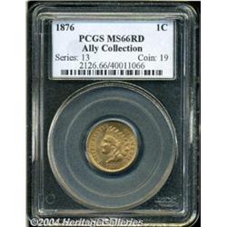 <B>1876<1C> MS66 Red PCGS.</B></I> Ex: Ally Collection. Business strikes this nice are seldom encountered. The surfaces retain all the bright luster of when the coin was first struck, while the usual bag marks normally found on business strikes are absent on this attractive specimen. There is just a tad of weakness to the highpoints on the ribbon, otherwise this coin displays very sharp detail. The mintage of 7,944,000 coins makes this one of the key dates in the Indian cent series. Always popular with collectors, this coin is a condition rarity as well. Population: 13 in 66, 1 finer (7/04). <BR><BR><B>Important notice:</B> Heritage usually auctions material at the rate of 200-250 lots per hour. On some occasions eBay Live bid software or the Internet may not be able to keep up with the pace of the auction. We recommend placing a realistic absentee bid now as insurance to avoid disappointment. Occasionally the auctioneer may eliminate or reject an eBay Live bid, and the auctioneer may also reopen a lot after the close of the eBay live bidding (usually because we missed an audience bid), and may reject your bid even if it shows you as the winning bidder. By bidding via eBay Live, you agree that Heritage may award the lot to another bidder at its sole discretion under the circumstances described above or any other reasonable circumstances. Since eBay bids are not shown to us until we open the lot on the floor, we treat those bids just like floor bids. In most cases the floor responds before the eBay bid is presented to us, due to Internet lag time, so for consistency we have made it a policy that floor bids are always considered first over tie eBay live bids. Also please note that all Heritage lots purchased through eBay Live carry a 20% Buyer's Premium. Please make sure you read the Terms and Conditions before you bid. </span></font></tr></table></td></tr></table>