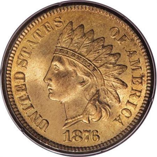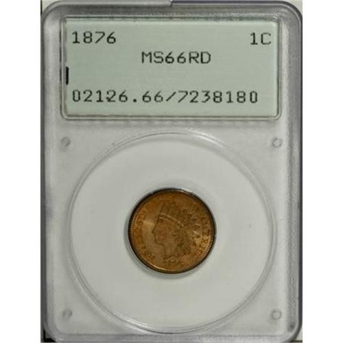 <B>1876 1C MS66 Red PCGS.</B></I> Cent production fell just shy of 8 million pieces for 1876, the second of three years of decline for the mintage of that denomination. This is a frosty and immensely appealing example from the centennial year, well-defined and largely mark-free with eminently original color and incredible visual appeal for the grade. Housed in a first-generation PCGS holder. Population: 13 in 66 Red, 1 finer (7/07).<I><BR>From The Santa Fe Collection.</B></I><BR><BR><B>Coin Engraver:</B> James B. Longacre<BR><BR><b>Shipping:</b> Coins & Currency (<a target="_blank" href="http://www.heritageauctions.com/common/shipping.php">view shipping information</a>\)