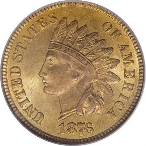 <B>1876 1C MS66 Red PCGS.</B></I> Though the two sides of this beautiful bronze cent display different colors, both are undeniably original. The obverse exhibits rich reddish-orange color with carrot-orange overtones, while the reverse displays largely the latter color with a hint of lemon-gold at the margins. PCGS has certified a single finer Red example (7/07).<I><BR>From The Santa Fe Collection.</B></I><BR><BR><B>Coin Engraver:</B> James B. Longacre<BR><BR><b>Shipping:</b> Coins & Currency (<a target="_blank" href="http://www.heritageauctions.com/common/shipping.php">view shipping information</a>\)