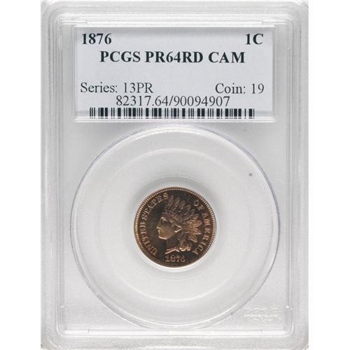 <B>1876 1C PR64 Red Cameo PCGS.</B></I> Fully struck with lovely lilac and sunshine-orange coloration and highly reflective fields. Frosted devices provide a pleasing cameo contrast on both sides. Population: 4 in 64 Red Cameo, 7 finer (2/07).<BR><BR><b>Shipping:</b> Coins & Currency (<a target="_blank" href="http://www.heritageauctions.com/common/shipping.php">view shipping information</a>)
