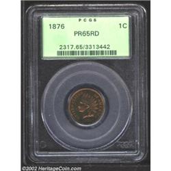 1876 1C PR65 Red PCGS. A desirable proof type candidate from the 1870s, this well mirrored Gem displays lustrous surfaces in orange-red and lilac shades. More deeply set olive tinting confirms the originality of this attractive specimen. Sharply struck.From the Joseph P. Gorrell Collection. Important notice: We expect to be auctioning lots at the rate of 200-250 per hour. Sometimes eBay Premier live bid software cannot keep up with that pace, so we strongly recommend that you place a realistic proxy bid now as insurance to avoid disappointment. Also please note that all Heritage/CAA lots purchased through eBay Premier carry a 20% Buyer's Premium. Please make sure you read the Terms and Conditions.
