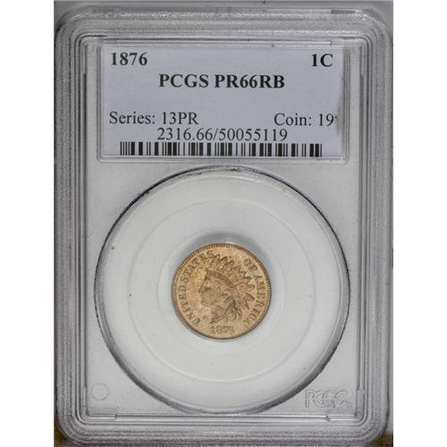 <B>1876<1C> PR66 Red and Brown PCGS.</B></I> While used for multiple years, the proof dies were polished in 1876 removing some of the polishing marks seen on earlier years. This is a deeply mirrored and well preserved proof striking that shows a bit of mottled olive, brown, and darker red coloration over each side. An impressive example from the Centennial year.<BR><I>From The Ron W. Keeney Collection.</B></I>