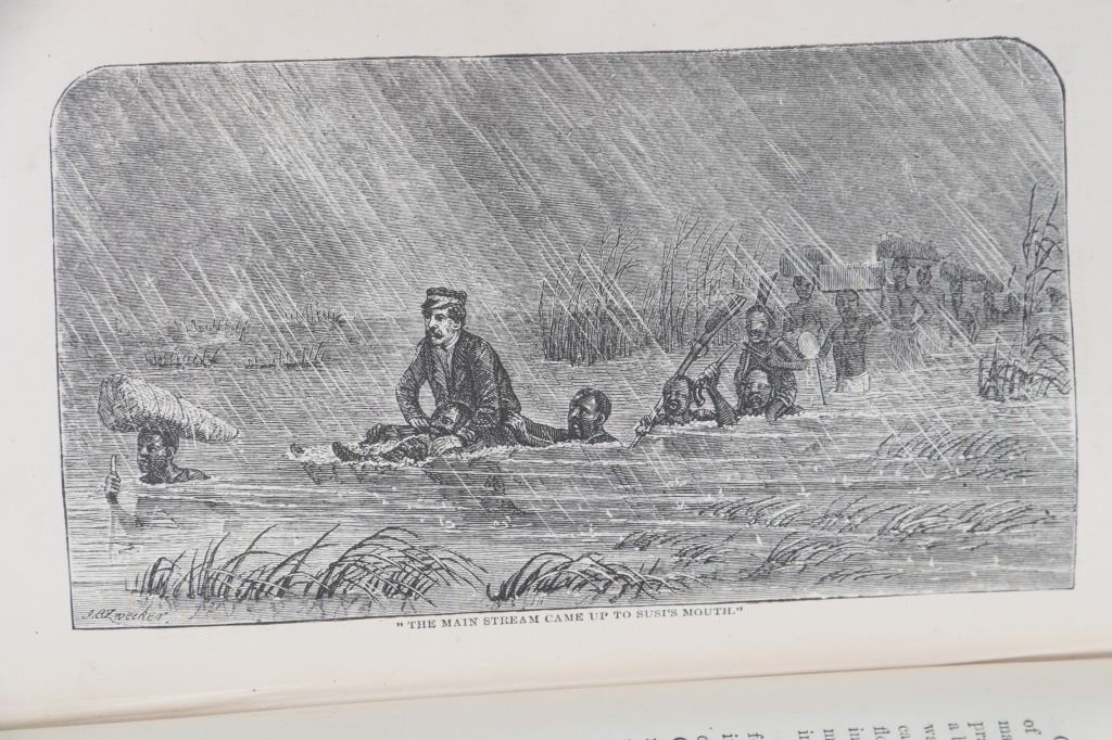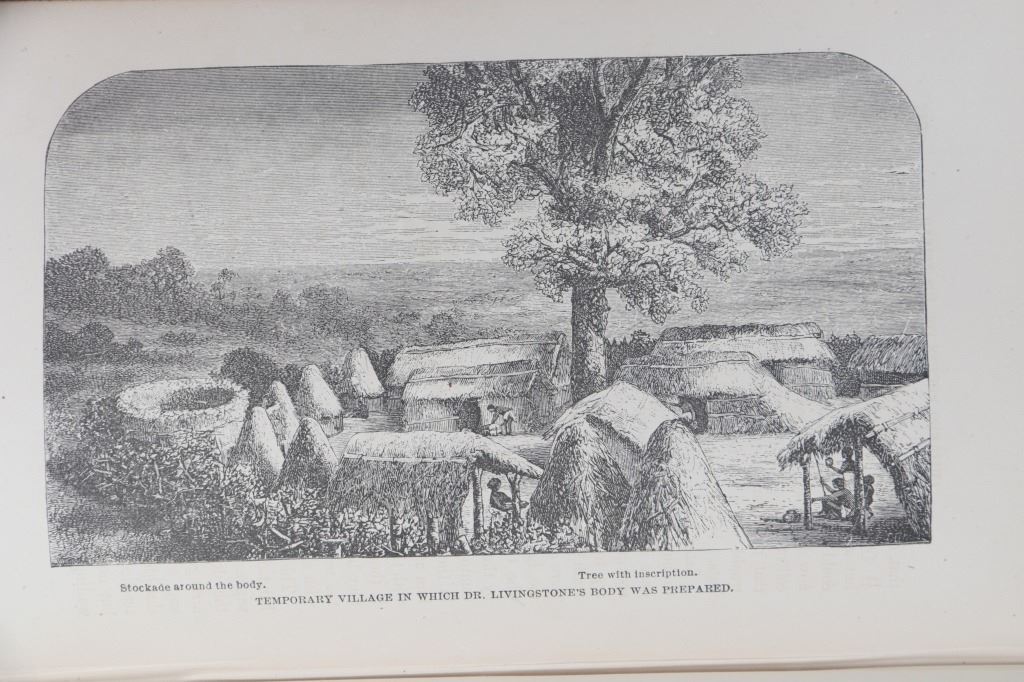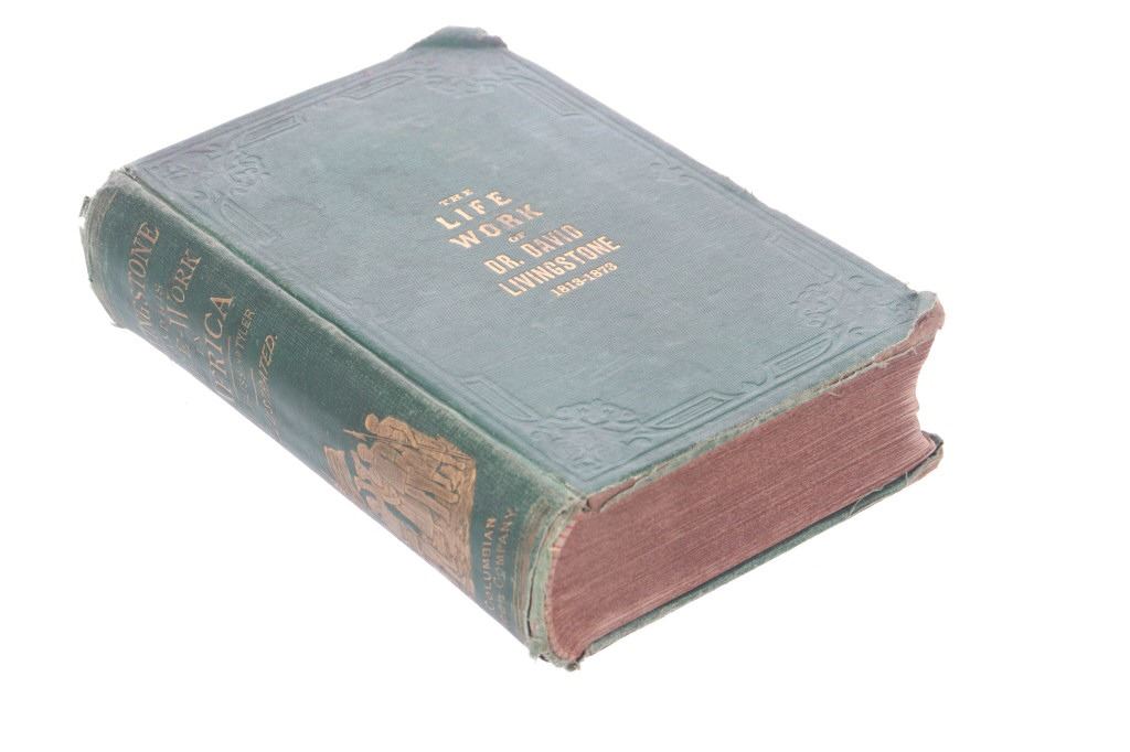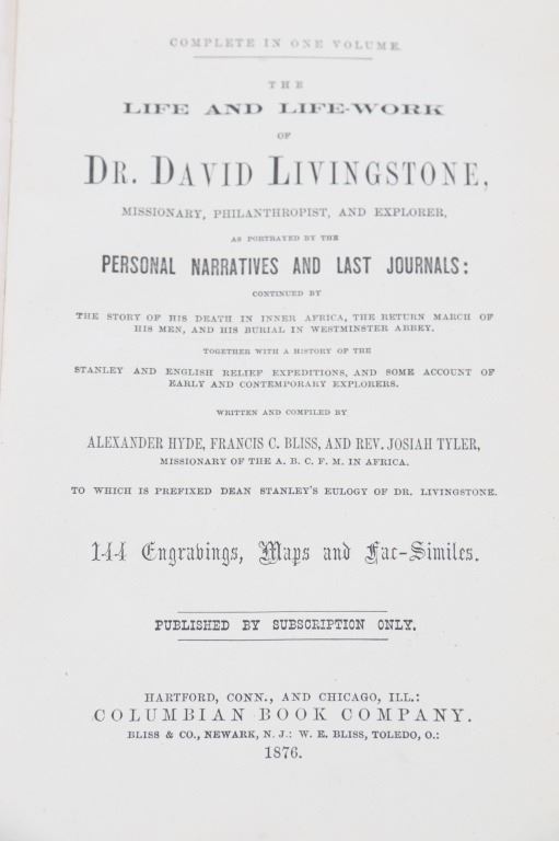 For your consideration in this lot is an 1876 first edition of "The life Work of Dr David Livingstone" by Hyde, Bliss, Tyler. The book includes a history of the Stanley and English relief expeditions and some account of early and contemporary explorers. The book is graced with 144 engravings, maps, and facsimiles. The book has a green cloth cover with gold embossed lettering and an image on the spine. The book shows wear to the corners and edges of the cover, but the pages inside are in good condition. The book measures 9" x 6 1/2" x 2 1/4".