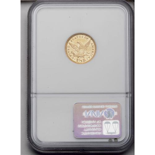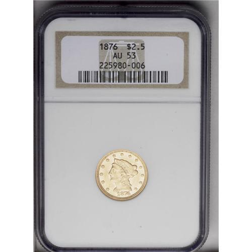 1876 $2 1/2 AU53 NGC. Pleasing light yellow surfaces a 1876[$2 1/2] AU53 NGC.