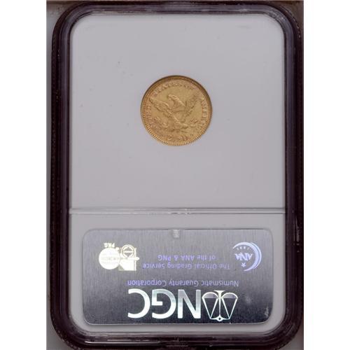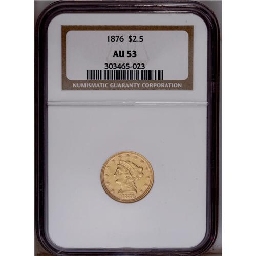<B>1876<$2 1/2> AU53 NGC.</B></I> This is a scarce (and perhaps underrated) coin in all grades, doubly so in AU condition. This lightly circulated example is typically soft over the central devices and shows the diagnostic raised bar at the jawline. Only a single pair of dies was used for the tiny mintage of 4,176 pieces. A short pinscratch between stars 5 and 6 is the most obvious disturbance. Census: 11 in 53, 56 finer (3/06). <BR><BR><B>Important notice:</B> Heritage usually auctions material at the rate of 200-250 lots per hour. On some occasions eBay Live bid software or the Internet may not be able to keep up with the pace of the auction. We recommend placing a realistic absentee bid now as insurance to avoid disappointment. Occasionally the auctioneer may eliminate or reject an eBay Live bid, and the auctioneer may also reopen a lot after the close of the eBay live bidding (usually because we missed an audience bid), and may reject your bid even if it shows you as the winning bidder. By bidding via eBay Live, you agree that Heritage may award the lot to another bidder at its sole discretion under the circumstances described above or any other reasonable circumstances. Since eBay bids are not shown to us until we open the lot on the floor, we treat those bids just like floor bids. In most cases the floor responds before the eBay bid is presented to us, due to Internet lag time, so for consistency we have made it a policy that floor bids are always considered first over tie eBay live bids. Also please note that all Heritage lots purchased through eBay Live carry a 20% Buyer's Premium. Please make sure you read the Terms and Conditions before you bid. This lot is being auctioned in conjunction with a live floor auction by Heritage Galleries & Auctioneers. All final auction and invoice information will be supplied by Heritage Galleries & Auctioneers, and all other information should be considered preliminary. Lot:2429 <BR><BR><B>Winning Notification and Billing:</B> After the FINAL session in this auction is complete, Heritage will send e-mail and snail mail invoices. This process normally takes several days. All final auction and invoice information will be supplied by Heritage Galleries & Auctioneers, and all other information should be considered preliminary. <BR><BR>This auction will be conducted on a live auction floor and over the Internet through eBay Live. If you choose to place an absentee bid, please take a moment to <font color='#0000ff'><u><a href='http://pages.ebay.com/liveauctions/help/before/laabsentee.html'>learn how eBay Live absentee bidding works</a></u></font><font color='#000000'>