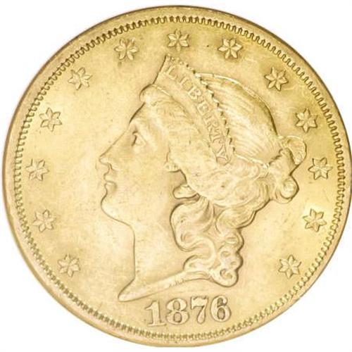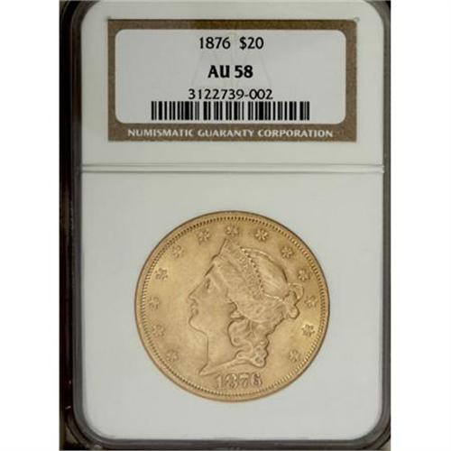 <B>1876 $20 AU58 NGC.</B></I> NGC Census: (817/710). PCGS Population (301/555). Mintage: 583,905. Numismedia Wsl. Price for NGC/PCGS coin in AU58: $930. (#8976)<BR><BR><B>Coin Engraver:</B> James B. Longacre<BR><BR><b>Shipping:</b> Coins & Currency (<a target="_blank" href="http://www.heritageauctions.com/common/shipping.php">view shipping information</a>)