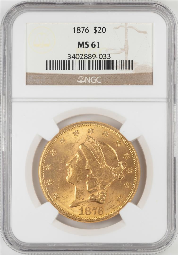 One 1876 $20 Liberty Head Double Eagle Gold Coin NGC MS61. NGC Certified.