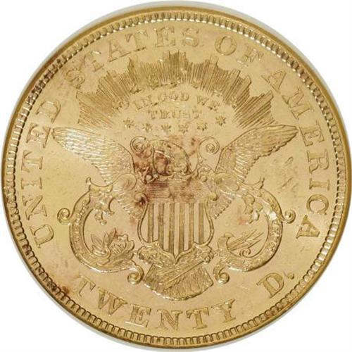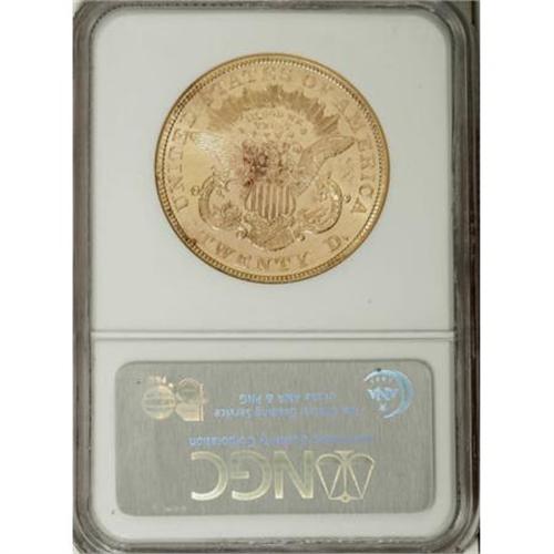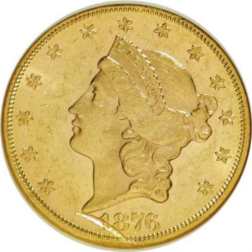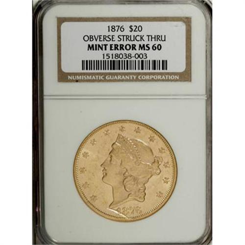 <B>1876 $20 Liberty Double Eagle--Obverse Struck Thru--MS60 NGC.</B></I> <BR><BR><B>Coin Engraver:</B> James B. Longacre<BR><BR><b>Shipping:</b> Coins & Currency (<a target="_blank" href="http://www.heritageauctions.com/common/shipping.php">view shipping information</a>)