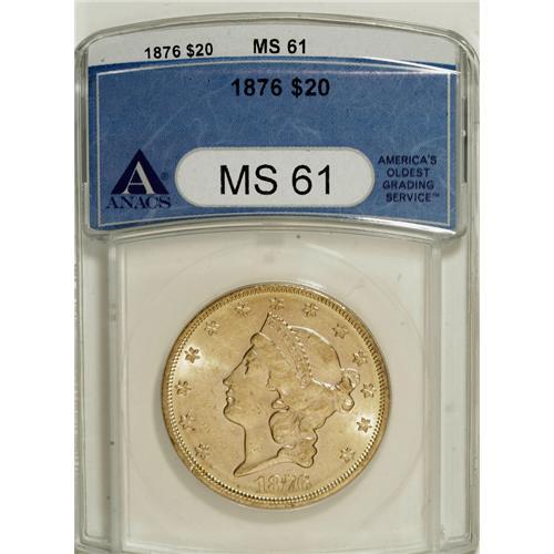 <B>1876 $20 MS61 ANACS.</B></I> Both sides of this piece have brilliant and highly lustrous yellow surfaces with intense mint frost. The surfaces are abraded to the expected extent for the grade.<BR><BR><b>Shipping:</b> Coins & Currency (<a target="_blank" href="http://www.heritageauctions.com/common/shipping.php">view shipping information</a>)