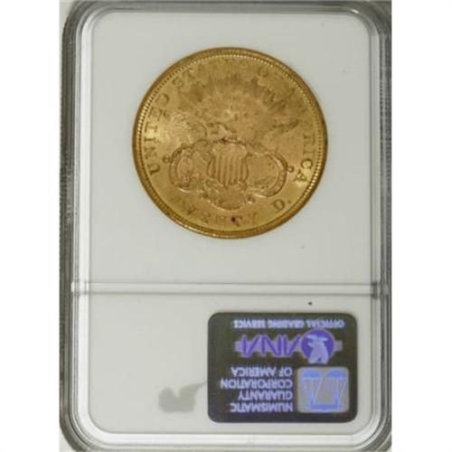 <B>1876 $20 MS61 NGC.</B></I> Light Motto. This lustrous representative offers apricot centers framed by green-gold margins. Few marks are noticeable for the grade, but a spot is present at 6 o'clock on the reverse.<BR><BR><B>Coin Engraver:</B> James B. Longacre<BR><BR><b>Shipping:</b> Coins & Currency (<a target="_blank" href="http://www.heritageauctions.com/common/shipping.php">view shipping information</a>)
