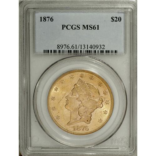 <B>1876 $20 MS61 PCGS.</B></I> Heavy Motto. This lustrous Centennial year double eagle is well struck and has a relatively clean reverse. A couple of obverse field abrasions are consistent with the grade. From the final year of the Type Two hub.<BR><BR><b>Shipping:</b> Coins & Currency (<a target="_blank" href="http://www.heritageauctions.com/common/shipping.php">view shipping information</a>)