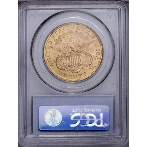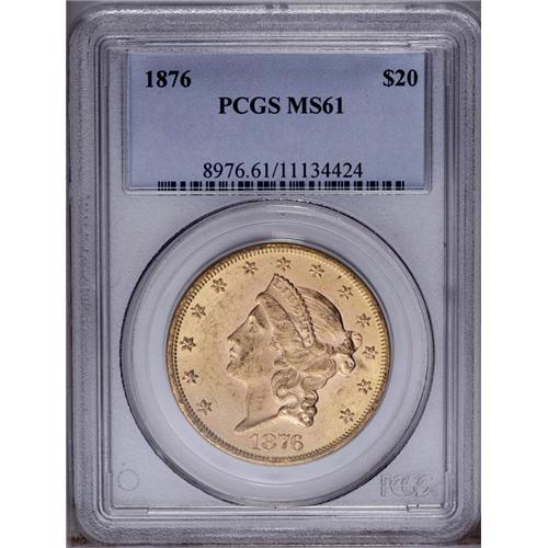 <B>1876<$20> MS61 PCGS.</B></I> Light Motto. This radiant Type Two twenty displays unbroken cartwheel luster, and the strike is crisp save for slight softness on WE. The honey-gold surfaces are abraded, but not more than is customary for the grade.