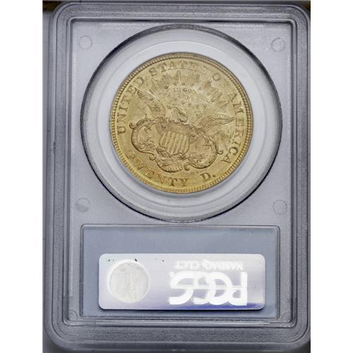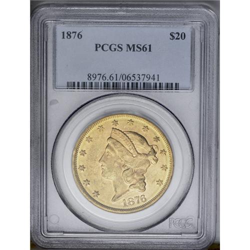 <B>1876<$20> MS61 PCGS.</B></I> Well struck with shimmering frosty luster and light yellow-gold and pastel rose patina. Moderate scuffiness on each side defines the grade.