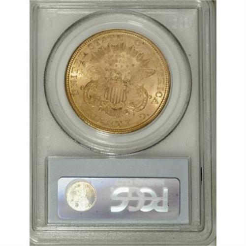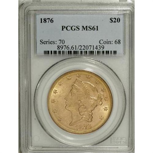 <B>1876 $20 MS61 PCGS.</B></I> Light Motto. This ephemeral reverse subtype is only found on certain 1876 double eagles, although collectors prize the date more as an example of the Type Two design. A lustrous piece that has moderate obverse marks and a relatively clean reverse.<BR><BR><b>Shipping:</b> Coins & Currency (<a target="_blank" href="http://www.heritageauctions.com/common/shipping.php">view shipping information</a>)